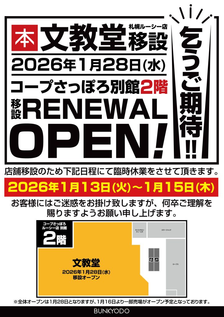 文教堂 札幌ルーシー店はコープさっぽろルーシー店別館2階への階層移設作業に伴い、